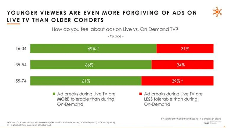 Among younger viewers, the willingness to watch ads is even more prevalent. Around 66% of all viewers say that ad breaks are more tolerable during live TV than they are for on-demand viewing, but that number jumps to 69% among respondents ages 16 to 34.