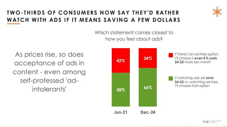 The study released by Hub shows that ad tolerance has grown markedly in the past few years. In 2021, 58% of viewers said they’d rather put up with ads if it meant saving $4 to $5 per month on a subscription. By December 2024, that number had risen to 66%.
